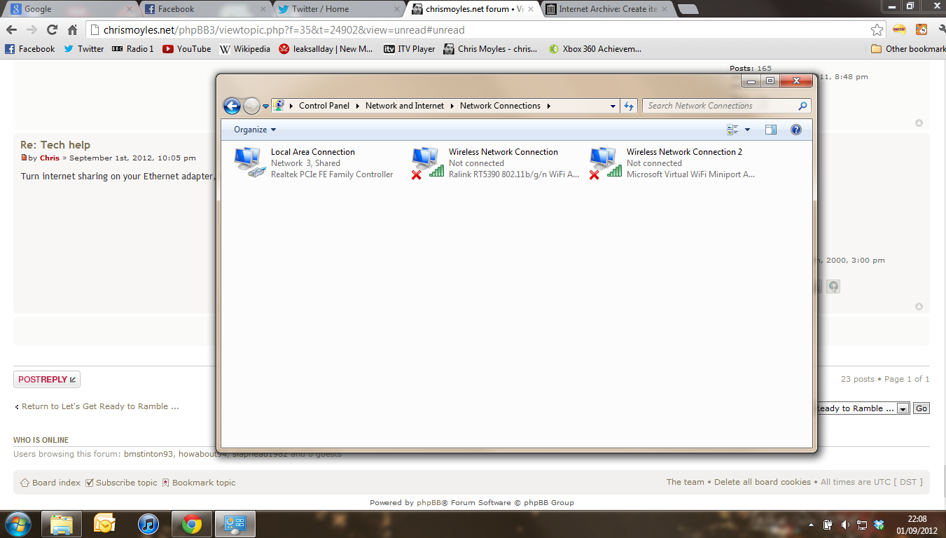 After clicking 'Change adapter settings' I am greeted with this screen. I right clicked on Local Area Connection and shared that one.